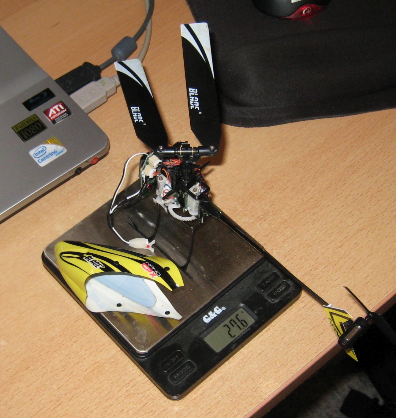 Gewicht mit „normalem“ Akku: 46g – also mit Booster 5,4g Mehrgewicht. (Red Power Akku 250mAh 7,2g; nano-tech 300mAh 8,4g)