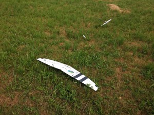 War wohl zu weit weg – Spektrum halt. Dann eingeschlagen aus 30m Höhe fast senkrecht runter. Nach dem Crash sah ich noch, dass das Höhenruder ab war (Gabel am Gestänge gesprengt). Könnte natürlich auch der Grund sein.